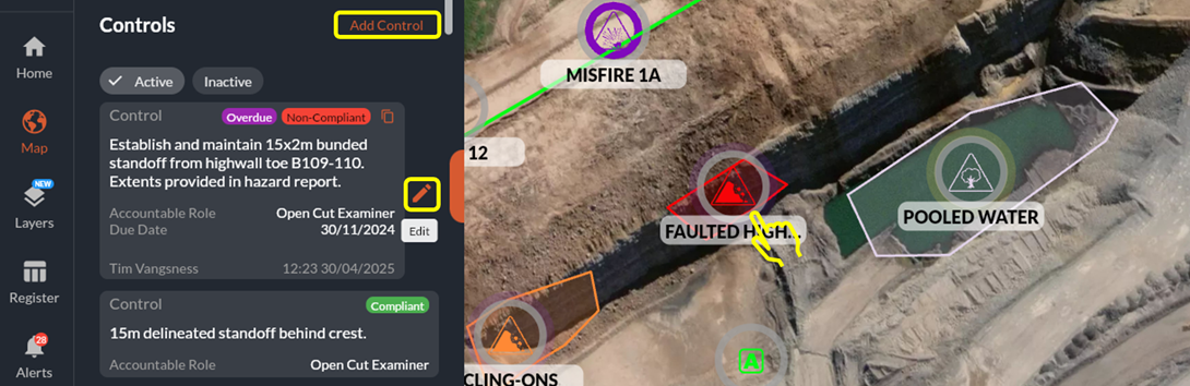 by selecting that hazard/feature in the Register, by clicking the icon on the