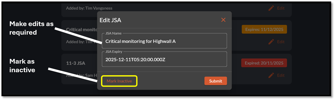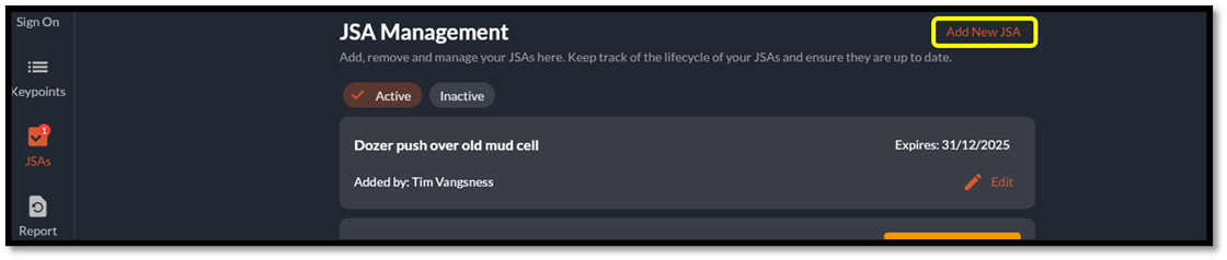 JSAs can be added, edited and marked as inactive. Old JSAs