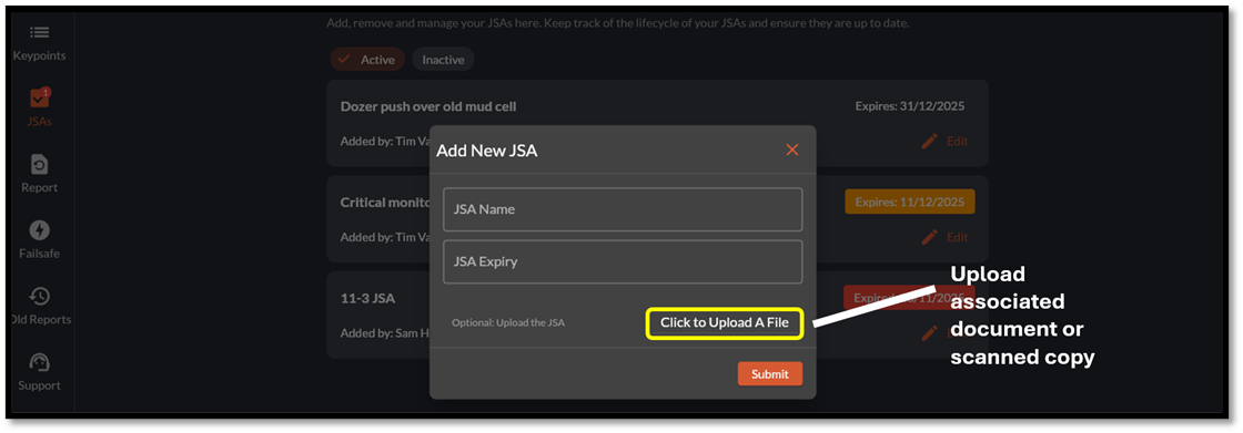 Users have the option to name the JSA, add an Expiry date, and upload an