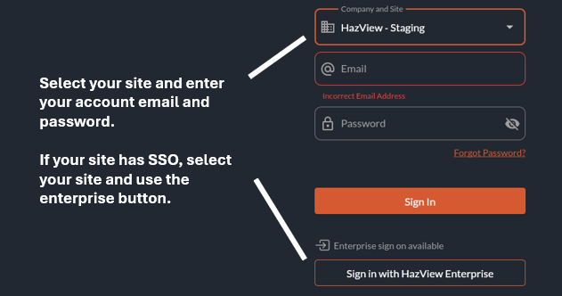 If your company does not have SSO, you will need an account to be made. Ask your admin or HazView staff at