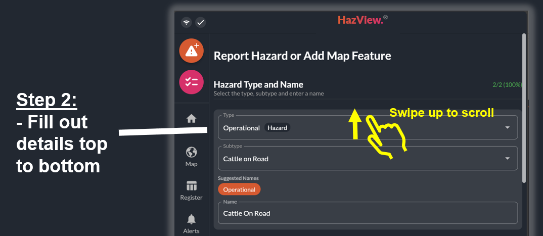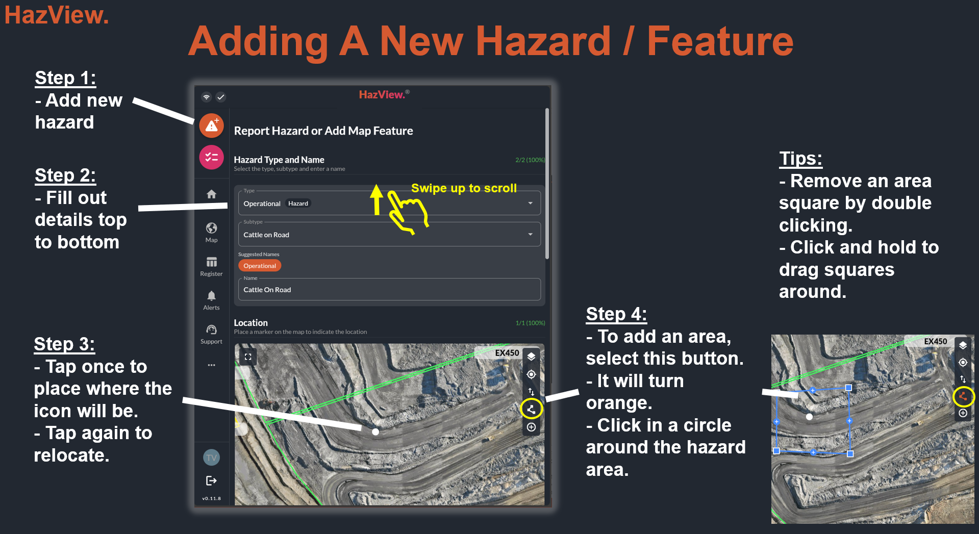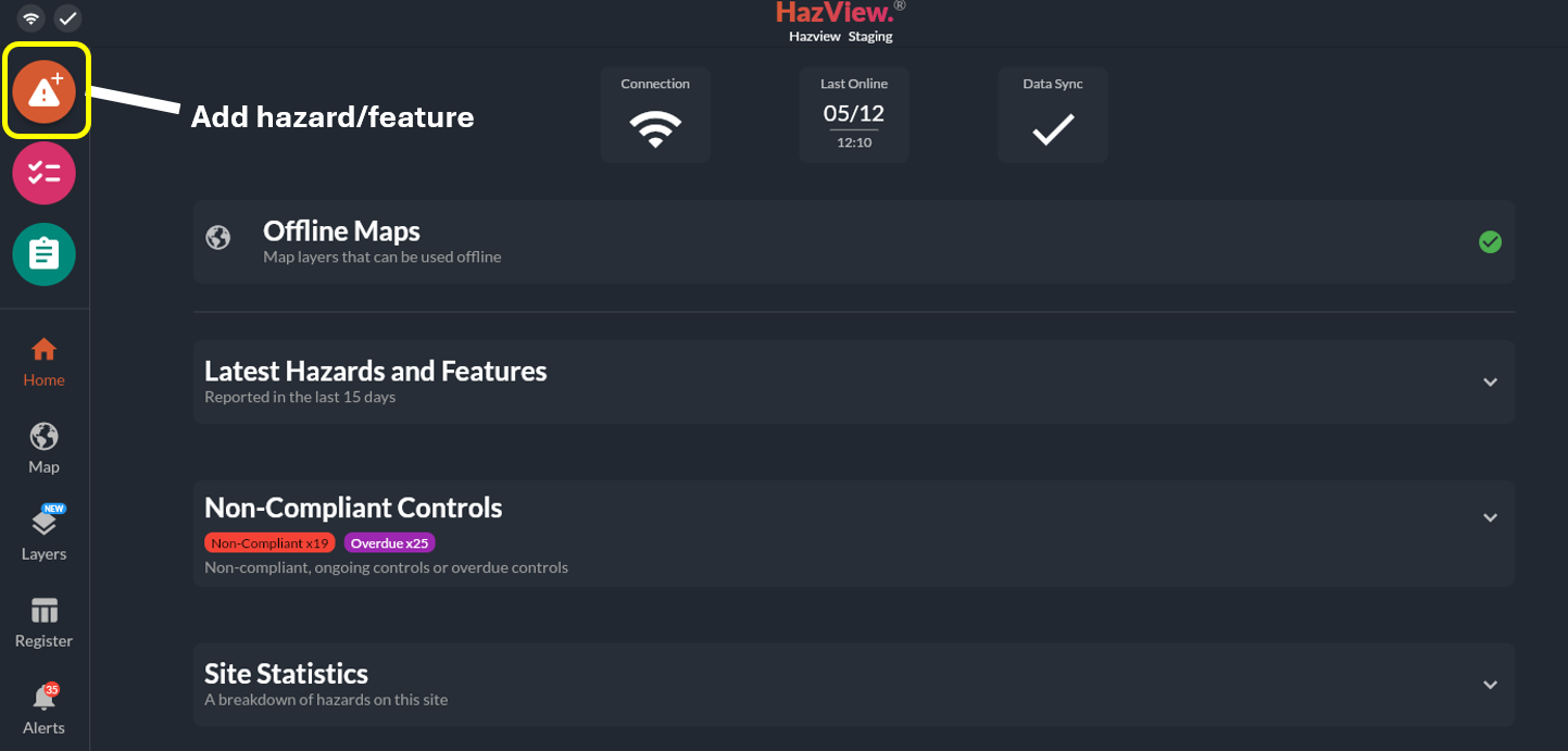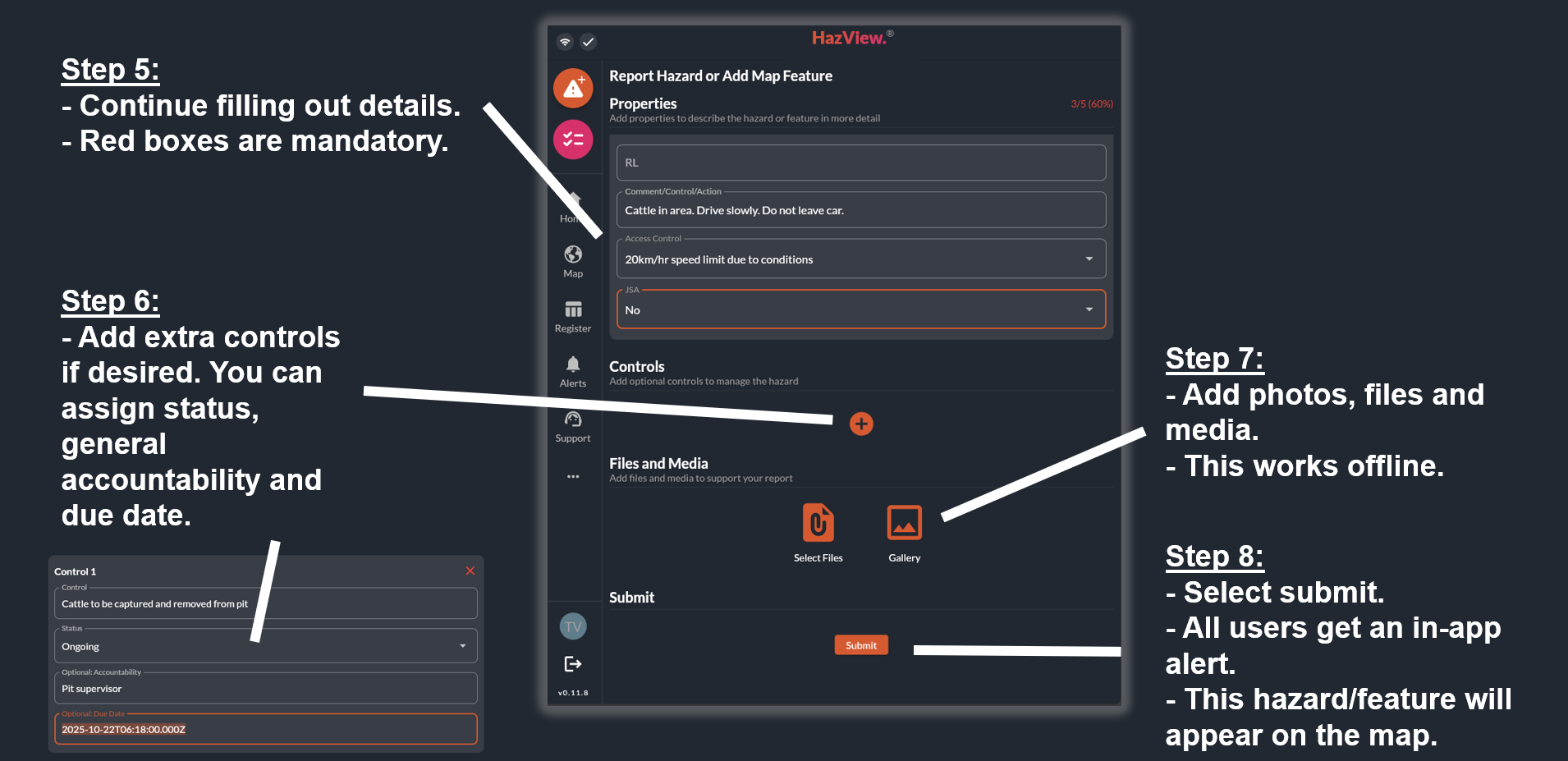 Hazards are added directly from the HazView map. Each hazard includes location, description, controls, photos and associated actions. Red fields are mandatory.