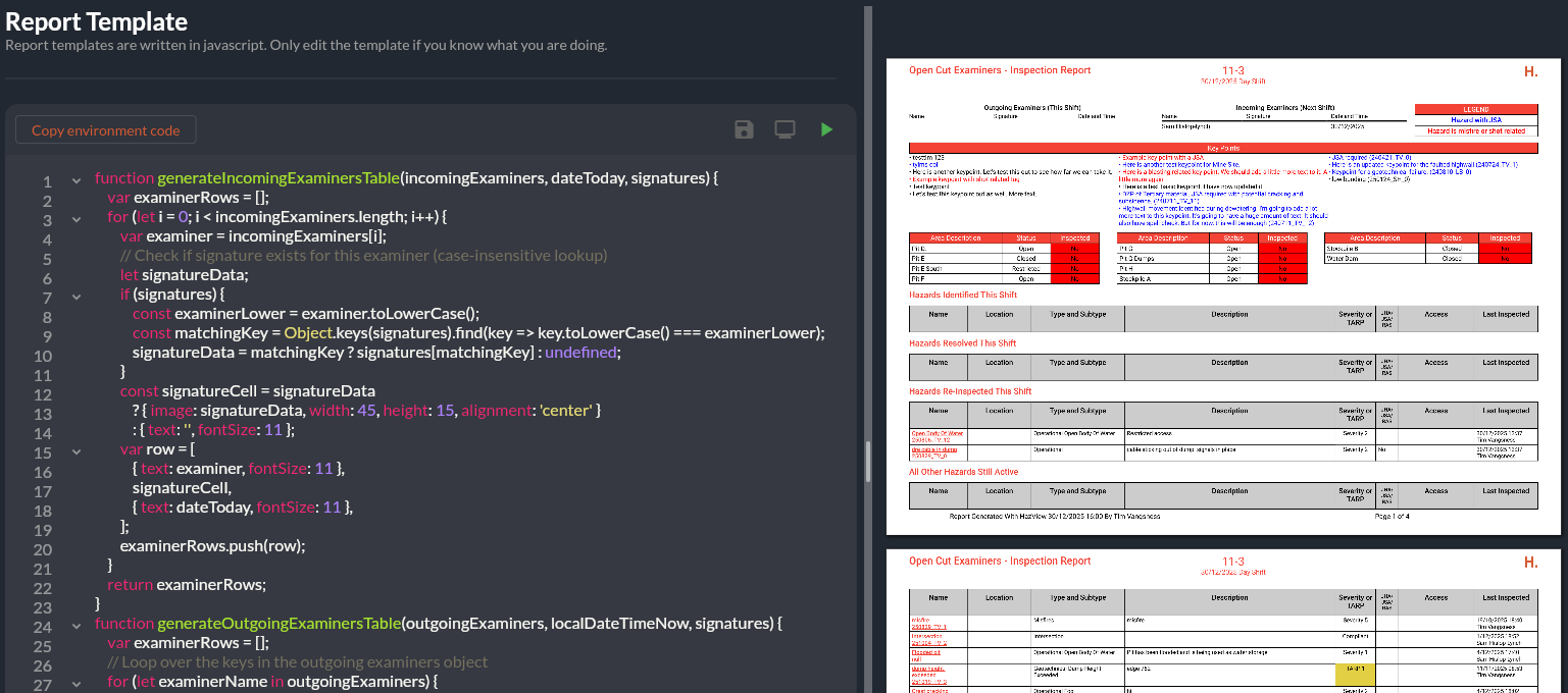 Caution: The report template should not be customised without guidance from HazView staff. Users who are not familiar with javascript should not touch the code.