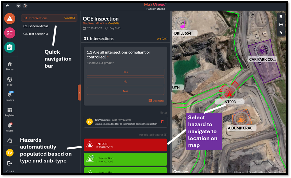 Users can quickly see what hazards/features have been inspected this shift by the green tick next to its icon.