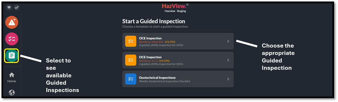 To access guided inspections, click the green icon. On large screens this will be at the top left. On small screens this will be at the bottom.