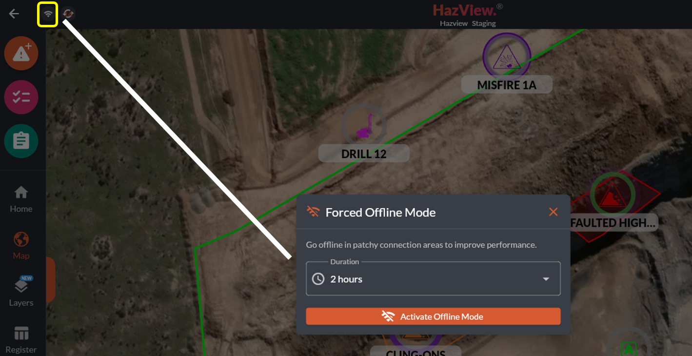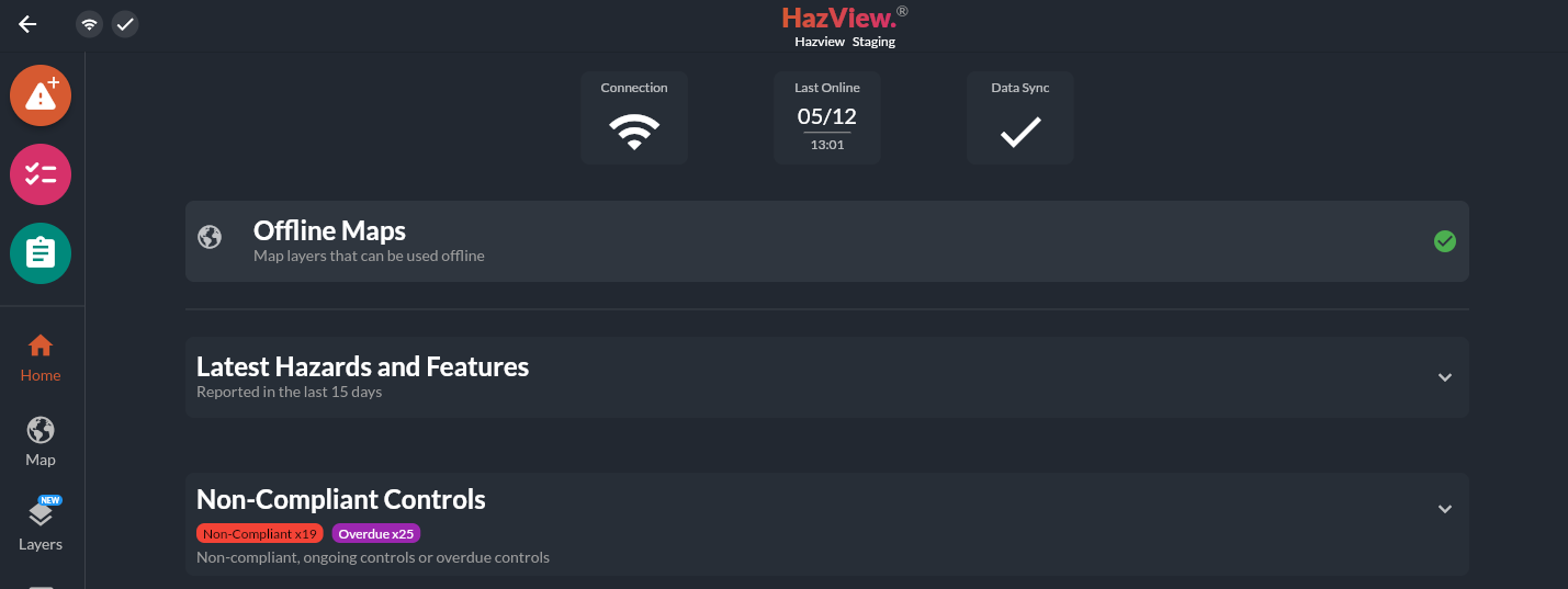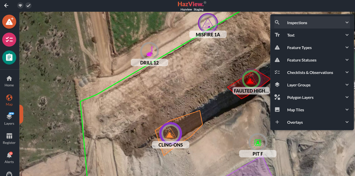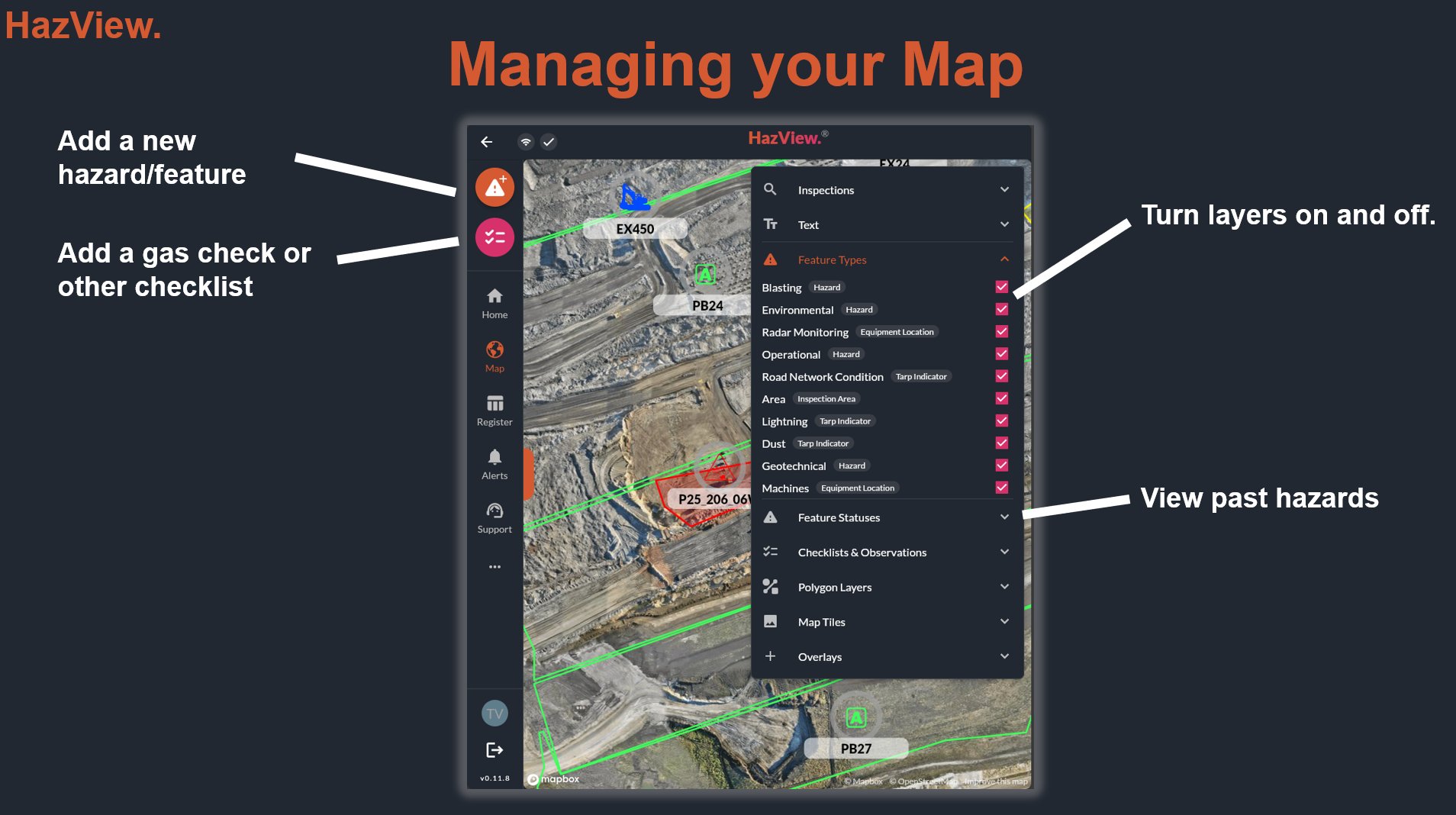 The HazView map is the main interface for viewing hazards, completing inspections, placing new hazards and managing site information.