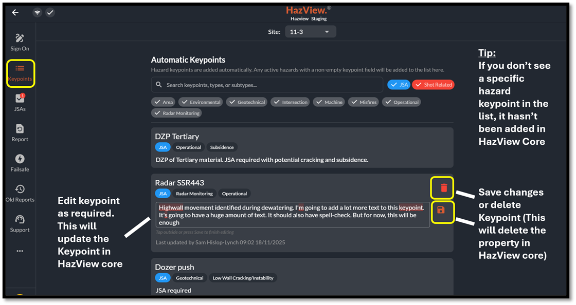 Automatic keypoints are populated from HazView Core.