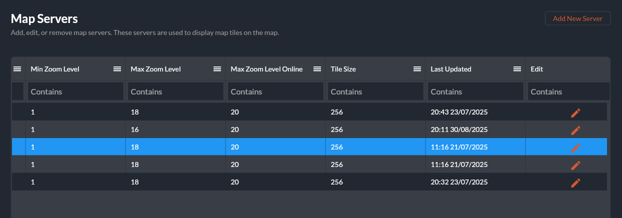 Adminstrators have full control over which map tile servers are shown. This can be linked to any open server. Your sites current settings are shown including the min zoom, max zoom (offline), max zoom online and the tile size. For large sites, setting the max zoom will limit how many tiles have to be downloaded to a users device for offline usage.