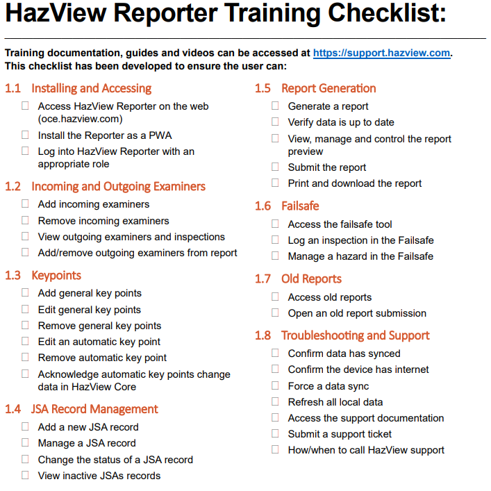 Attached is a training checklist that can be used to verify users are familiar with all the core functions of HazView Reporter.