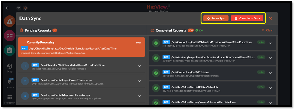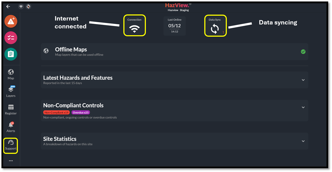 Figure 43 – The support desk, internet connection and data syncing statusForce Sync and Clear Local Data